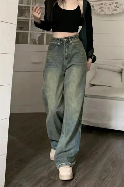 レディースカジュアルワイドレッグバギージーンズ、ウォッシュデニムパンツ、レディースストレートパンツ、ヴィンテージストリートウェア、90年代ハイウエスト、y2k