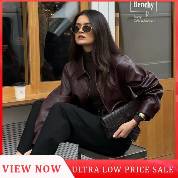 モデル番号:2024 Burgundy Chic Women's Lapel Leather Short Coat