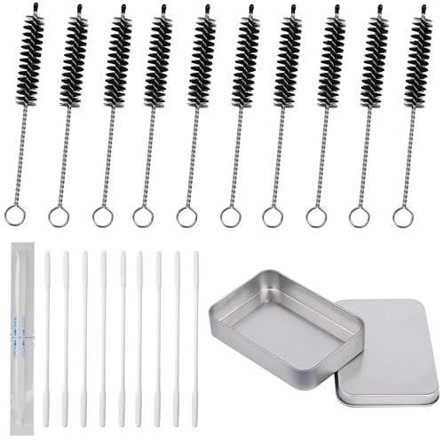 ・製品仕様クリーニングブラシのサイズ:90mm*36mm*8.5m、ブラシの部分の長さは約36mm。綿棒の長さは約80mm、収納ボックスのサイズは100mm*70mm*20mmです。クリーニングブラシ10本と綿棒10本、金属製収納ボックス付きのセット。ブラシと綿棒を効率よく収納し、持ち運びも便利です。