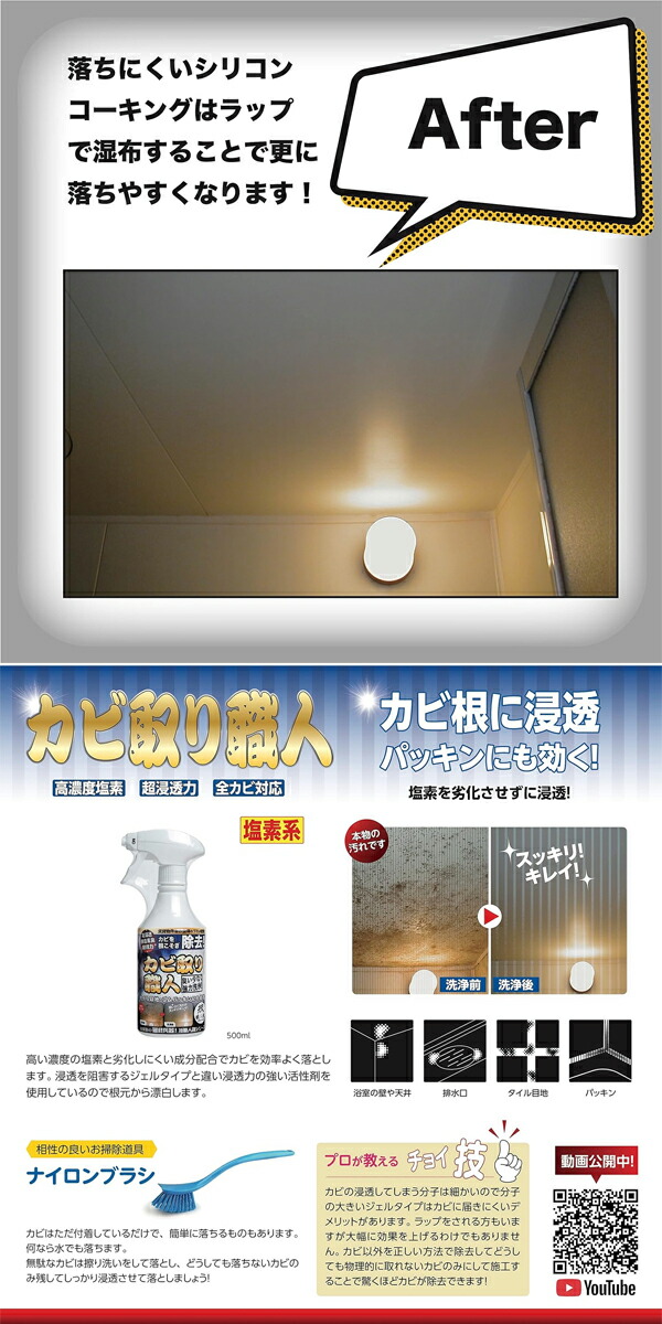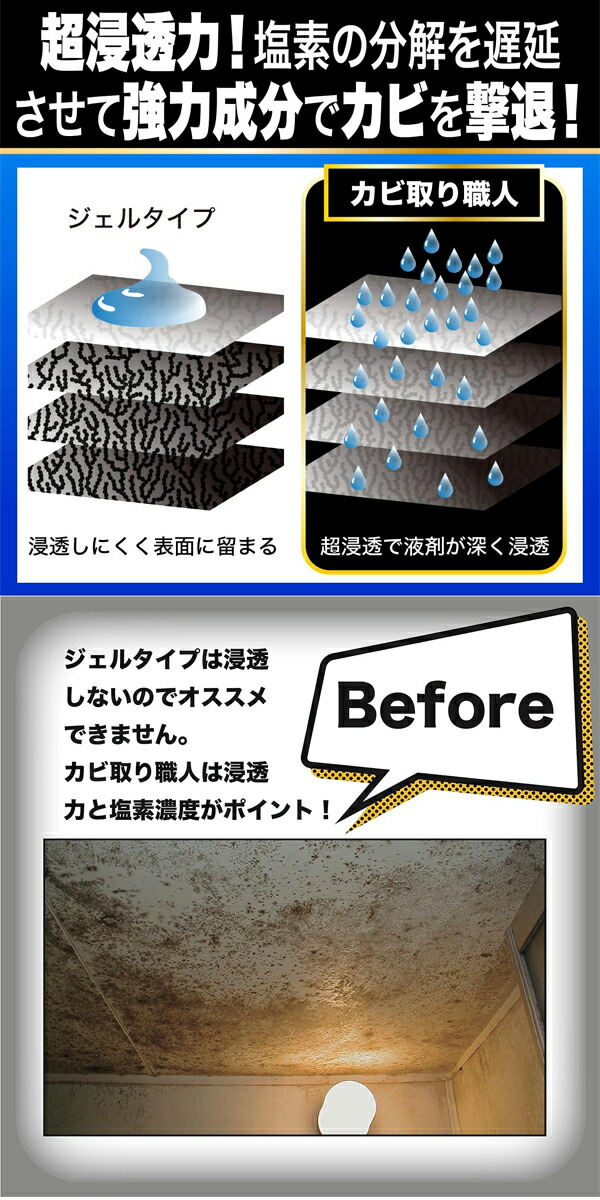 ●浸透しないジェルタイプと違い高浸透タイプなのでカビの根元に最も到達します。