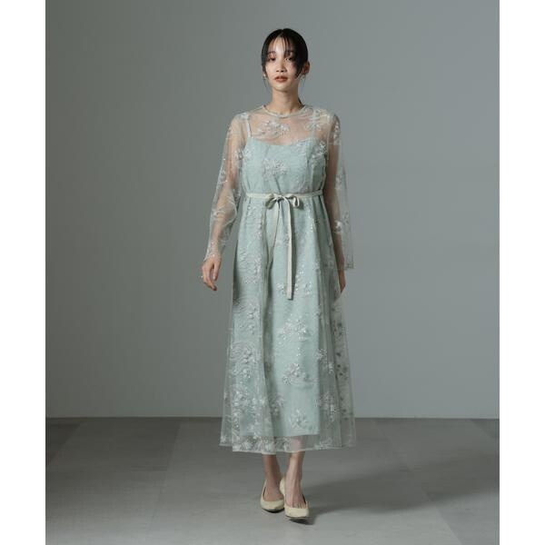 キラキラと特別感のあるスパンコールが刺繍されたドレスと、柔らかなジョーゼットのインナードレスを合わせた一着。高めの腰位置切り替えと細見えするシルエットがより大人っぽい印象に。結婚式やパーティなど、特別なひと時のお呼ばれドレスとして重宝します。