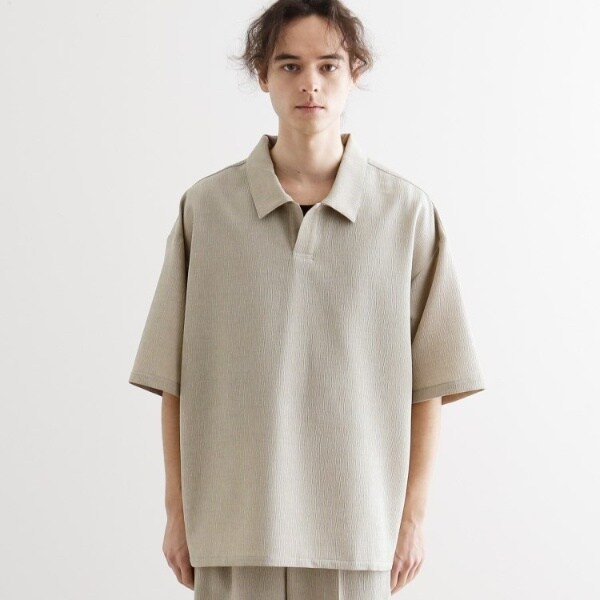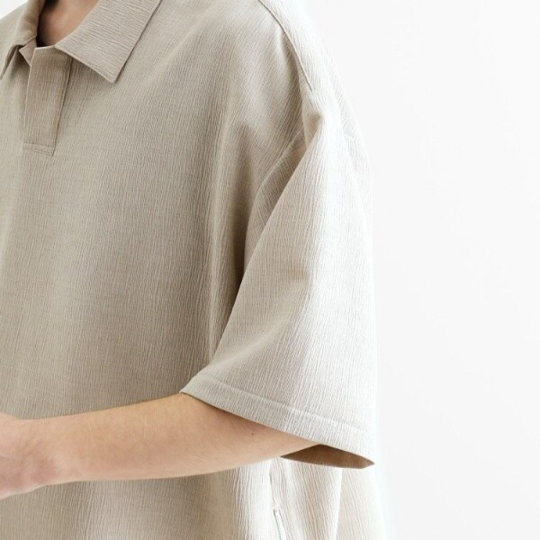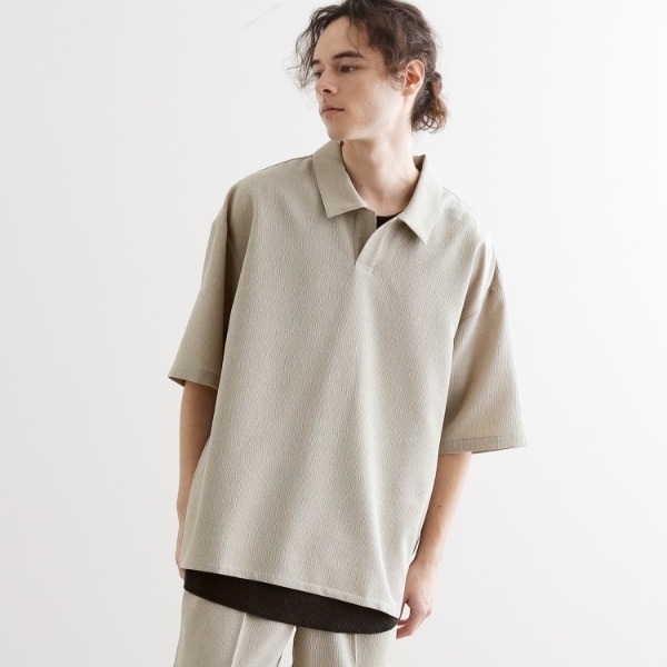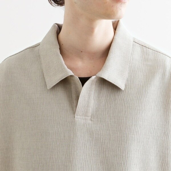 ボタンレスのスキッパータイプですが、前立てをしっかりとつけることで、衿がしっかり収まるためラフな印象になりません。