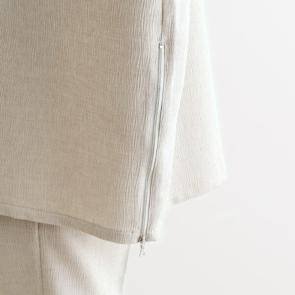 表面のランダムな凹凸感と横ストレッチがあり、さらっとしたタッチでシワになりにくい特徴があります。