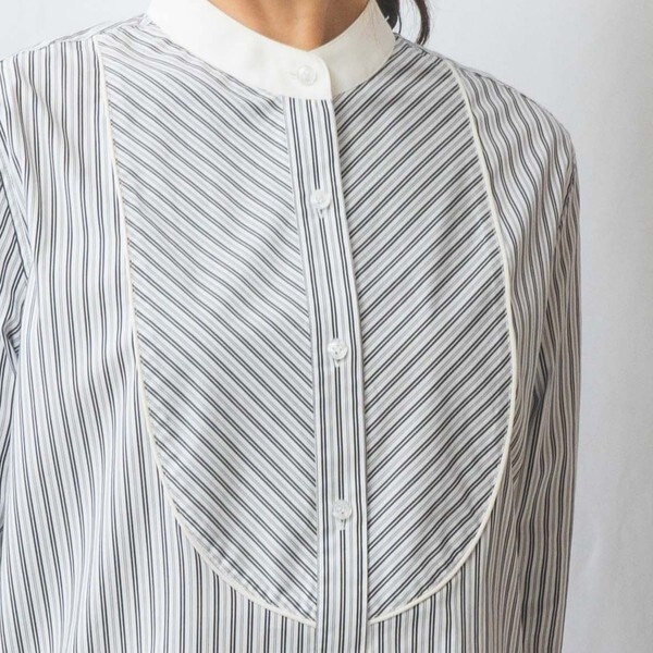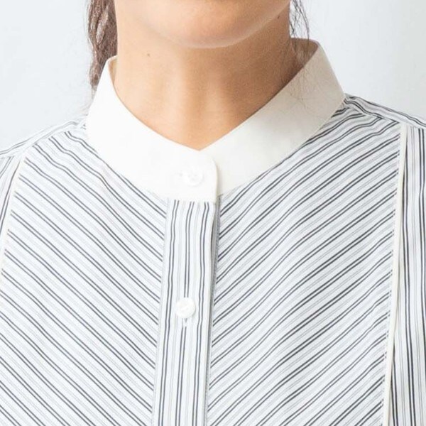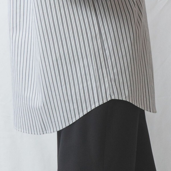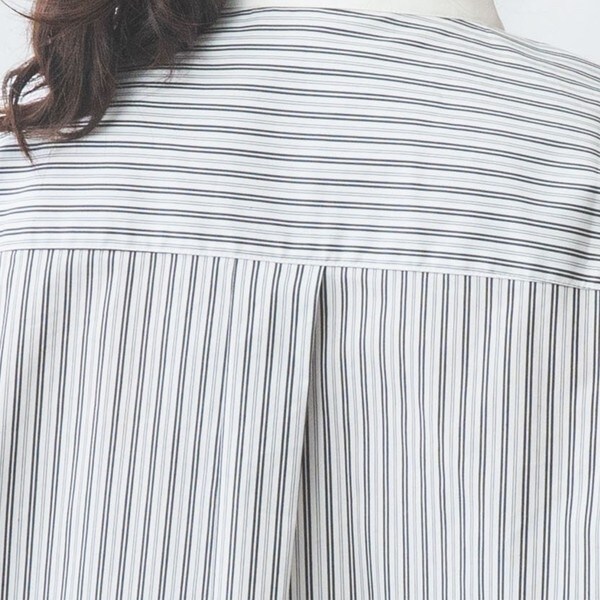細やかなマルチストライプ柄が上品な女性らしさを演出するシャツ。首元はクレリック風のバンドカラーになっており、すっきりとした印象を与えます。ブサム部分にあえてバイアスを施すことで、表情に変化をつけています。バックにあしらわれたセンターボックスプリーツが自然な立体感をプラス。パンツと合わせてタックアウトしたコーディネートがおすすめです。