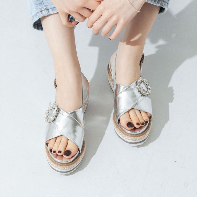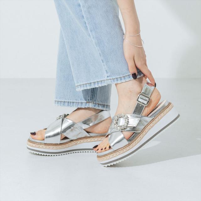 キラキラ輝くビジューが上品なクロスベルトデザインにあえてスポーティーな底とナチュラルなジュートを合わせて大人カジュアルな抜け感を演出。綺麗めにもカジュアルにもマッチする1足に仕上げました。ほとんど高低差がない厚底ソールなので疲れにくく、旅行やリゾートシーンにもおすすめ。