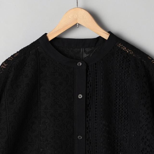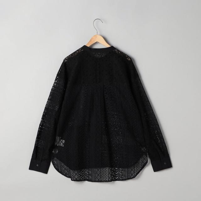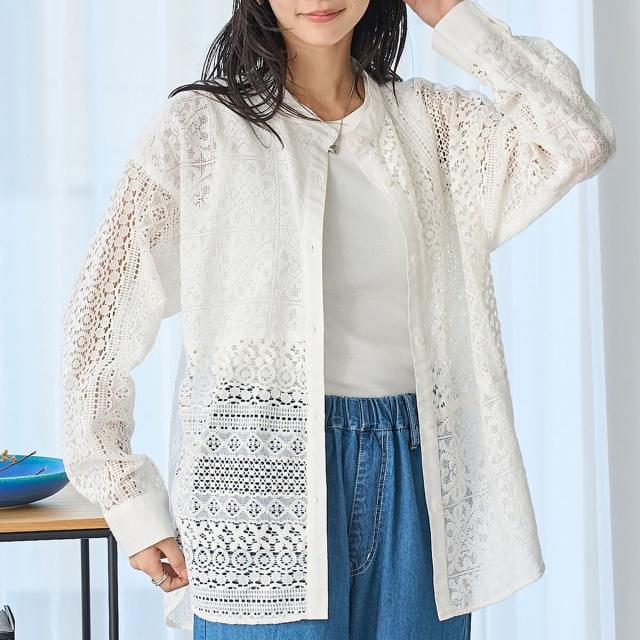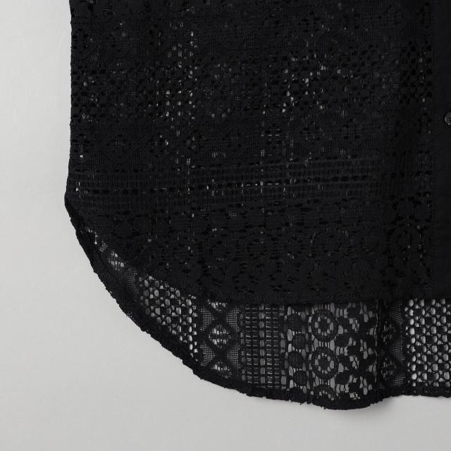レース生地をパッチワーク風に切り替えた、リメイク風のレースシャツです。