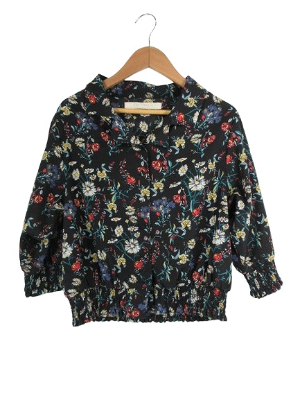 【中古】レイカズン Ray cassin ハーフスリーブ シャツ 開襟 ショート丈 ギャザー 花柄 サイズF 黒 QQQ レディース