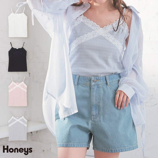 トップス キャミソール レース使い レースキャミ レースインナー ストレッチ ジャカード 綿混 無地 レディース SALE セール Honeys ハニーズ レース使いキャミソール