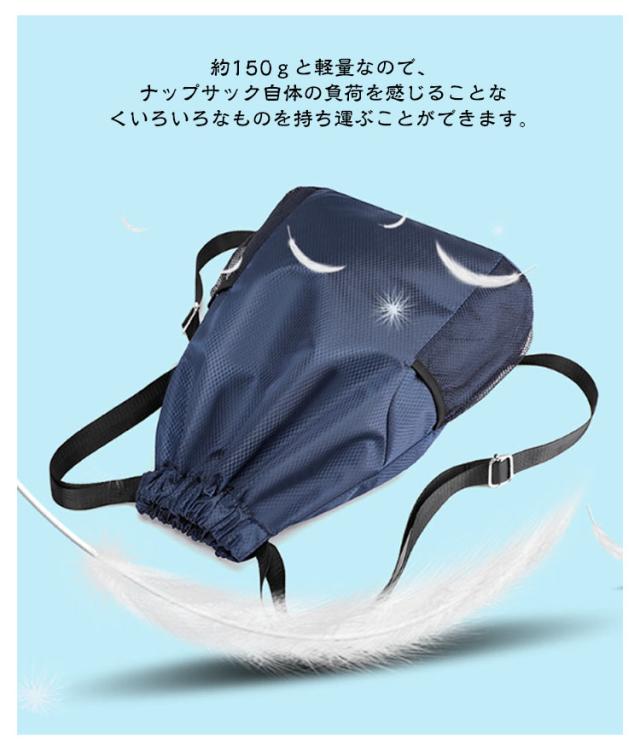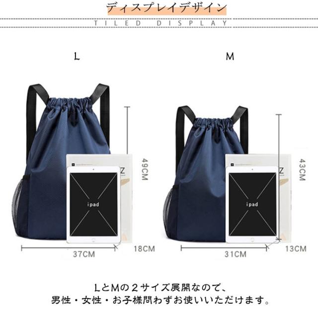 | 様々なシーンで活躍する軽量・撥水ナップサック 10色×2サイズ(L/M) A4サイズのファイルやタブレットなども入る大容量収納! サイドにはメッシュポケット、内側にはファスナーポケット付き! 高密度オックスフォード生地は蓮の葉のように水を弾く効果があり 水や汚れに強いのが特徴。 雨の日やアウトドアでも安心です。 約150gと軽量なので、ナップサック自体の負荷を感じることなくいろいろなものを持ち運ぶことができます。 紐を引っ張ればぎゅっと閉じられ、開ける時は多く開くので中身が取り出しやすい。ナップサックの使い勝手の良さが魅力! 出し入れ口はサイドポケットなど、負荷がかかる部分は縫製をしっかり補強しています。 LとMの2サイズ展開なので、男性・女性・お子様問わずお使いいただけます。 お子様の通学時のサブバック、部活の道具・着替え入れ、これからの季節にはプールバッグとしてもおすすめです! | |