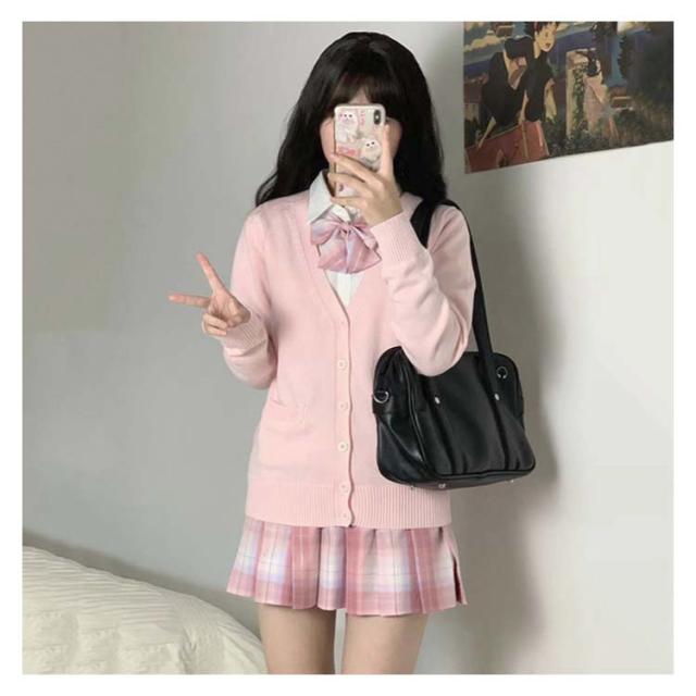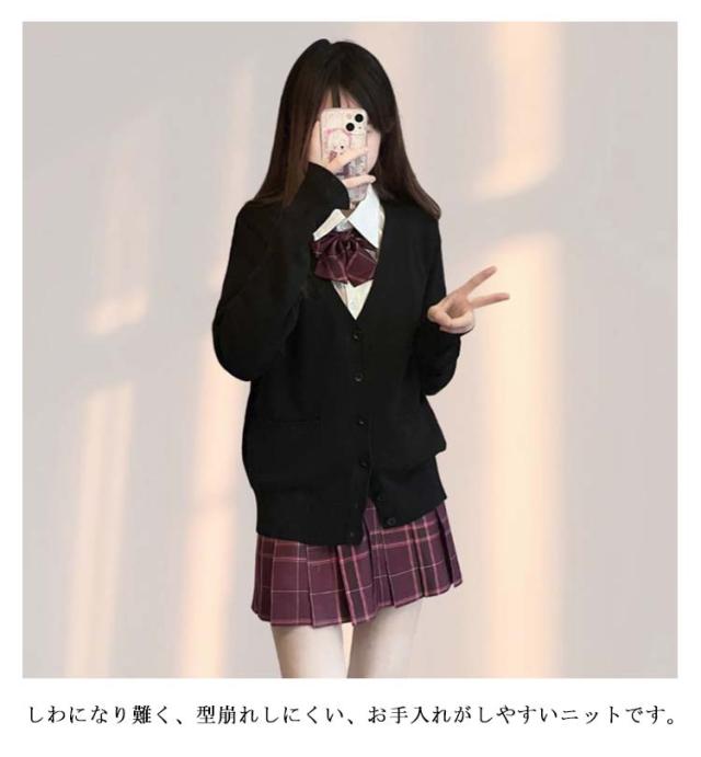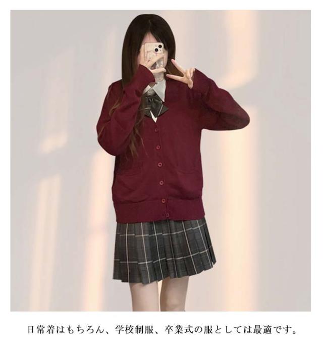 | 4点セット: カーディガン、スカート、シャツ、蝶ネクタイの4点セットです。 ▼スクールライフを快適に・無地前開きカーディガン 無地でシンプルなデザインなので、普段はもちろん色々なシーンで着用できる。 首元を綺麗に見せるVゾーンと、程よくゆとりを持たせたシルエットが清楚さを演出! しわになり難く、型崩れしにくい、お手入れがしやすいニットです。 ▼日常着はもちろん、学校制服、卒業式の服としては最適です。 | |