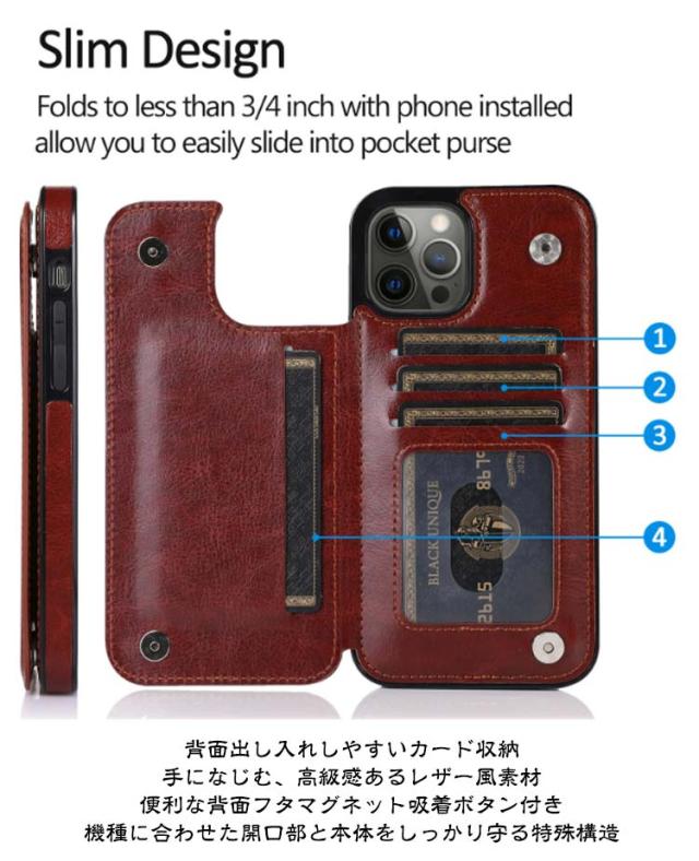 | ★背面カード収納iPhoneケース★ しっとりとした、本革のような肌触り。 高品質PUレザーの手帳型iPhoneケース。 スマートフォン本体をホールドするケースの素材にはTPU素材を使用しているため、 柔らかく付け外しも簡単で外す時に傷が付く心配がありません。 ★背面出し入れしやすいカード収納 ★手になじむ、高級感あるレザー風素材 ★便利な背面フタマグネット吸着ボタン付き ★機種に合わせた開口部と本体をしっかり守る特殊構造 端末部分はTPUソフト素材となっているため装着の際にiPhone傷つける心配もありません。 ■マグネットボタンスタンドフタ カードフタにマグネット付でぶらぶらしない。 カードフタがスタンドとして角度調整自由 ※機種よりカード入れポケット数違います。 123カード入れ 2.写真入れ | |