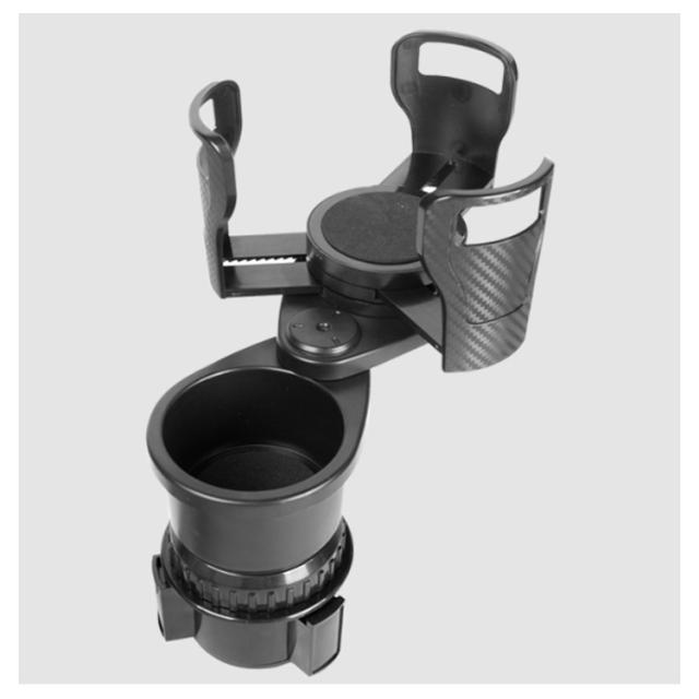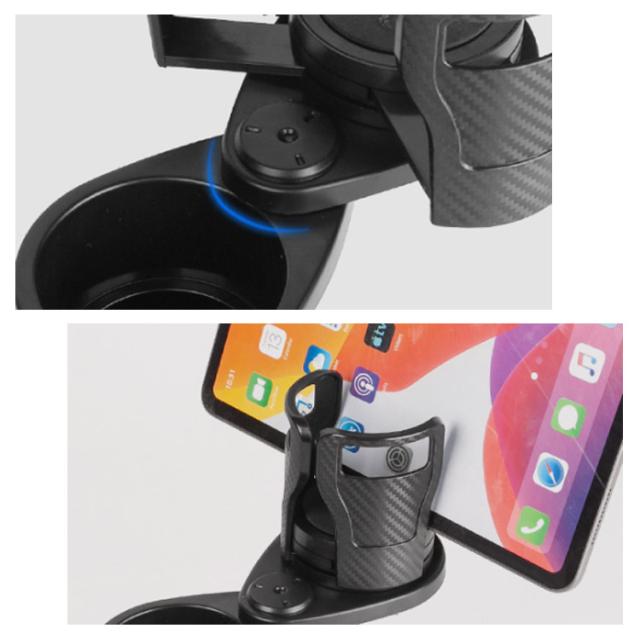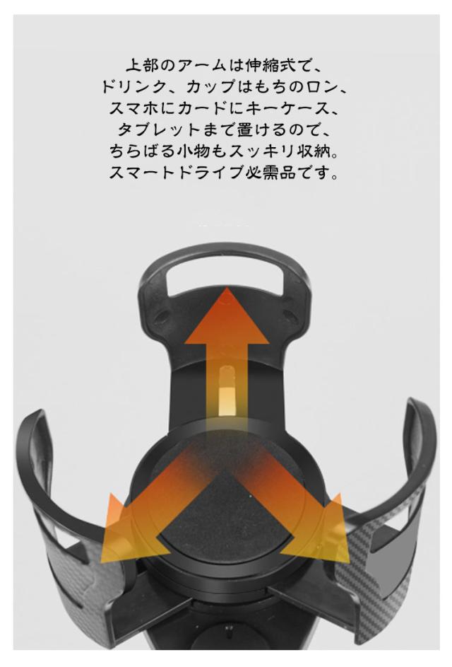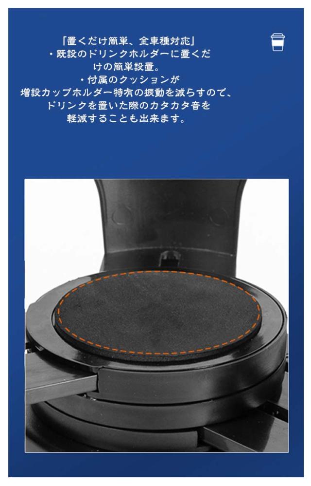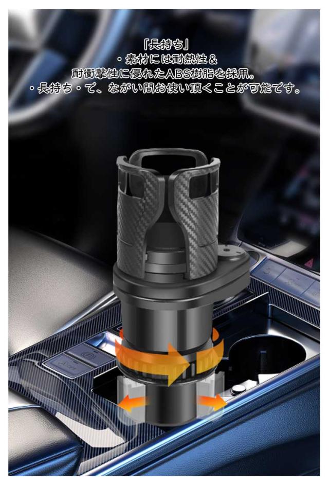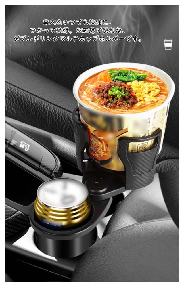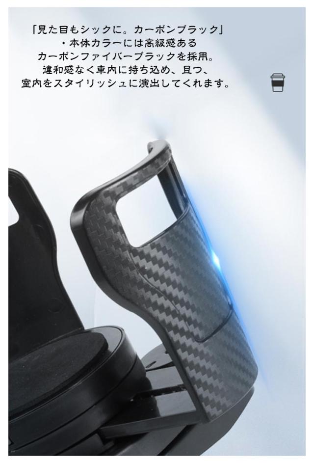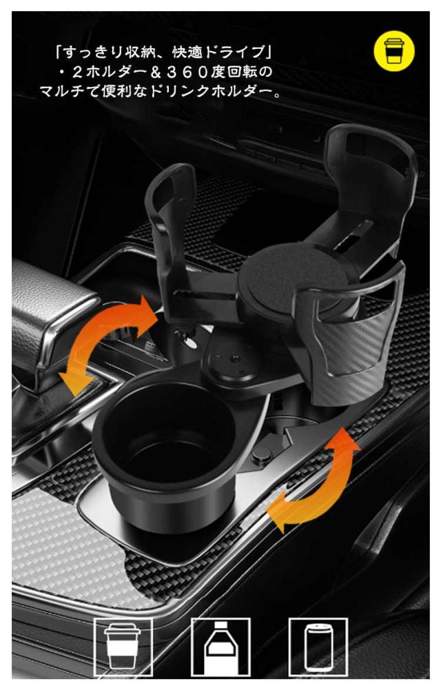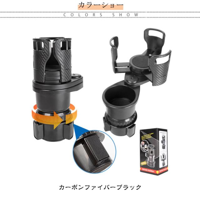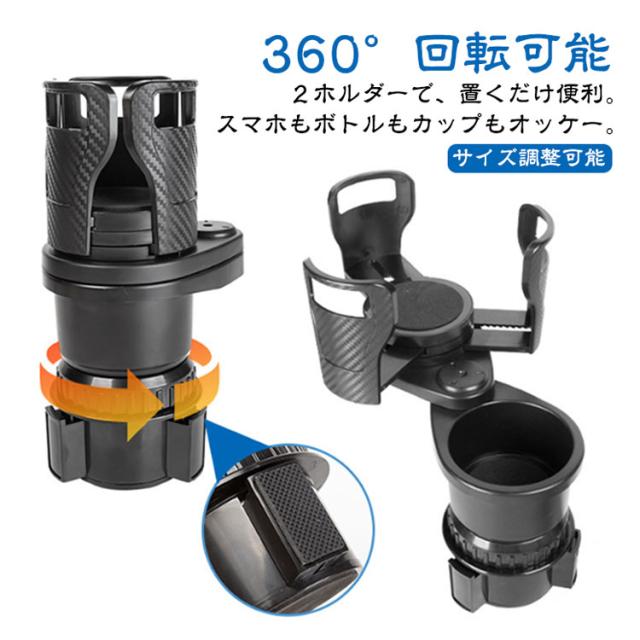 | 2ホルダーで、置くだけ便利。 スマホもボトルもカップもオッケー。 360°回転可能 上部&下部もサイズ調整可能 ・POINT.1 「すっきり収納、快適ドライブ」 ・2ホルダー&360度回転のマルチで便利なドリンクホルダー。 上部のアームは伸縮式で、ドリンク、カップはもちのロン、 スマホにカードにキーケース、タブレットまで置けるので、 ちらばる小物もスッキリ収納。スマートドライブ必需品です。 ・POINT.2 「2ホルダーで、マルチに固定」 ・便利でお得な2ホルダー。 可変式の上部カップホルダーは、なんでもマルチにしっかり固定。 360度回転式で、ドリンク、スマホをお好きな位置に簡単移動。 つかう前には戻れない。簡単・便利なドリンクホルダーです。 車の既存ホルダーに合わせて差し込み口を調整できるので、ピッタリフィット!(65〜95mmまで調整可能) ・POINT.3 「置くだけ簡単、全車種対応」 ・既設のドリンクホルダーに置くだけの簡単設置。 ・付属のクッションが増設カップホルダー特有の振動を減らすので、 ドリンクを置いた際のカタカタ音を軽減することも出来ます。 ・POINT.4 「長持ち」 ・素材には耐熱性&耐衝撃性に優れたABS樹脂を採用。 ・長持ち・で、ながい間お使い頂くことが可能です。 ・POINT.5 「見た目もシックに。カーボンブラック」 ・本体カラーには高級感あるカーボンファイバーブラックを採用。 違和感なく車内に持ち込め、且つ、室内をスタイリッシュに演出してくれます。 車内をいつでも快適に。 つかって納得。お洒落で便利な、ダブルドリンクマルチカップホルダーです。 | |