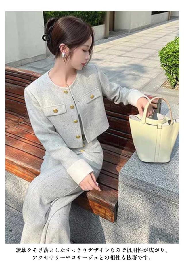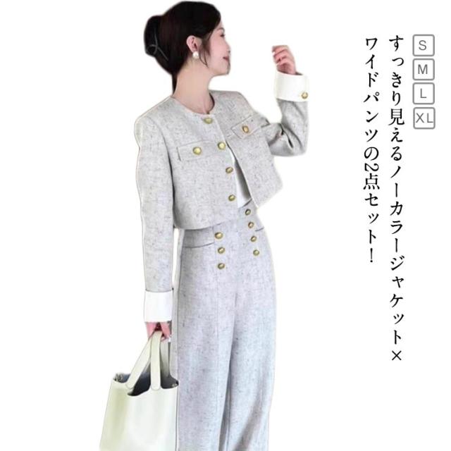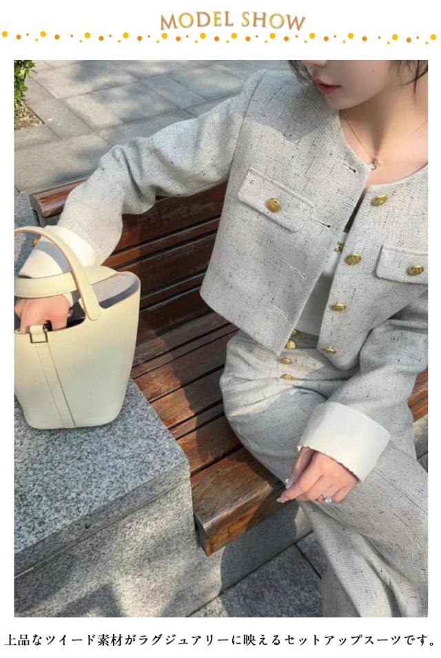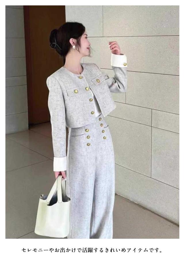 | すっきり見えるノーカラージャケット×ワイドパンツの2点セット! 上品なツイード素材がラグジュアリーに映えるセットアップスーツです。 ゴールド調ボタンが印象的なショート丈ジャケット。 表情感がありながら、伸縮性抜群のカットツイードで上品な佇まいに。 無駄をそぎ落としたすっきりデザインなので汎用性が広がり、アクセサリーやコサージュとの相性も抜群です。 セレモニーやお出かけで活躍するきれいめアイテムです。 | |