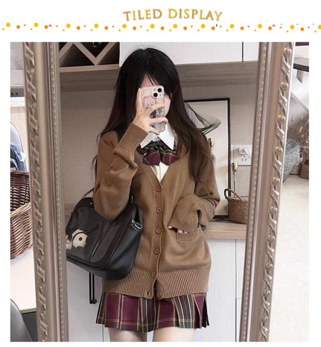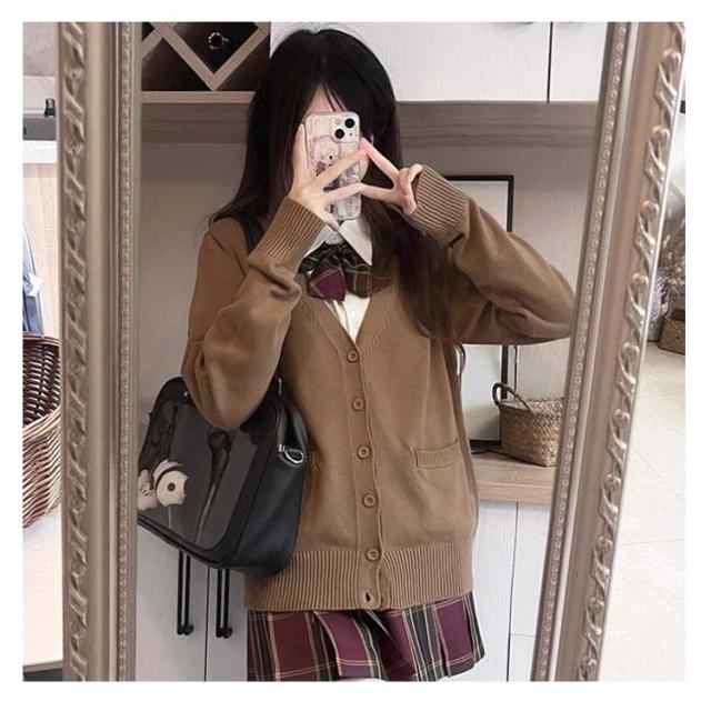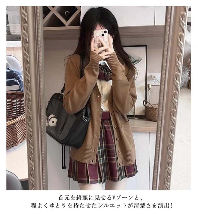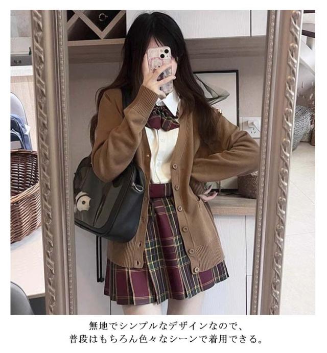 | 4点セット: カーディガン、スカート、シャツ、蝶ネクタイの4点セットです。 ▼スクールライフを快適に・無地前開きカーディガン 無地でシンプルなデザインなので、普段はもちろん色々なシーンで着用できる。 首元を綺麗に見せるVゾーンと、程よくゆとりを持たせたシルエットが清楚さを演出! しわになり難く、型崩れしにくい、お手入れがしやすいニットです。 ▼日常着はもちろん、学校制服、卒業式の服としては最適です。 | |