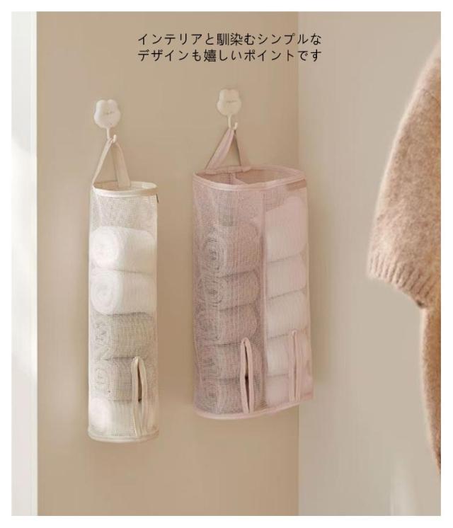 | 吊り下げ式でバッグ型の下着ストッカーです。 靴下や下着などをちょっと入れておくのにも便利。 メッシュ素材で中身が見えるので残量確認も一目瞭然♪ インテリアと馴染むシンプルなデザインも嬉しいポイントです☆ シンプルなデザインは、お部屋の雰囲気にしっくりなじみます。 | |