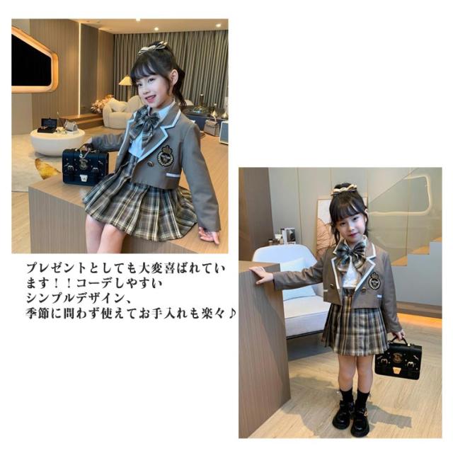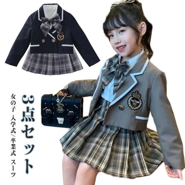 3点セット 女の子 卒園式 スーツ 春秋 卒業式 リボン付き かわいい フォーマルスーツ ジャケット 入学式 スーツ セットアップ 七五三 長袖 子供 プリーツスカート 入学式 上下セット チェック柄スカート 結婚式 小学生 撮影 発表会 子供服 フォーマル JK制服