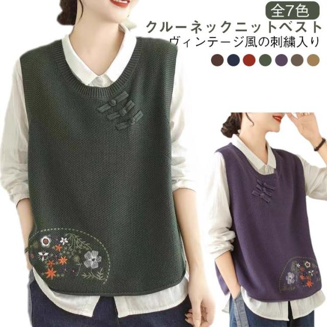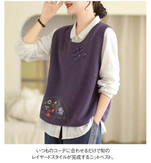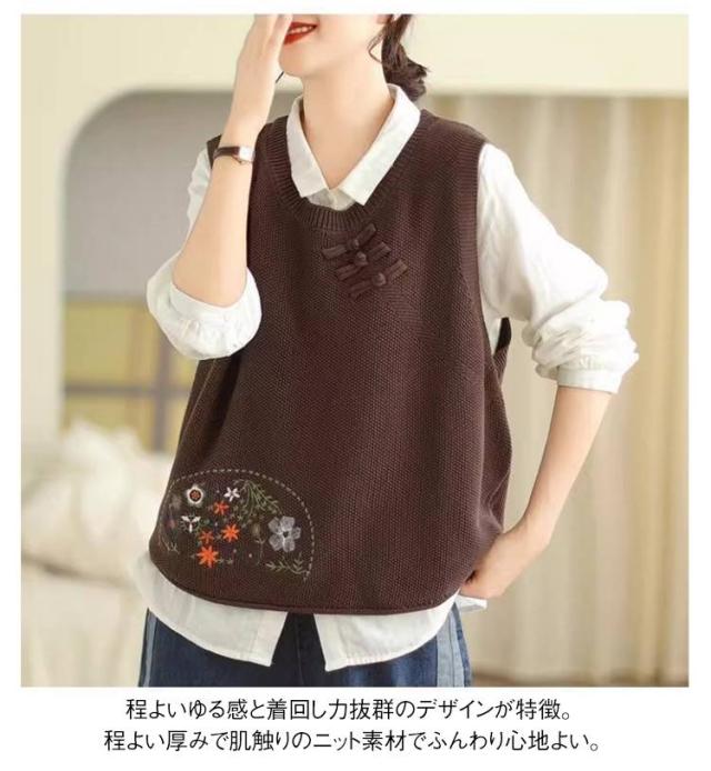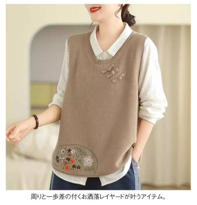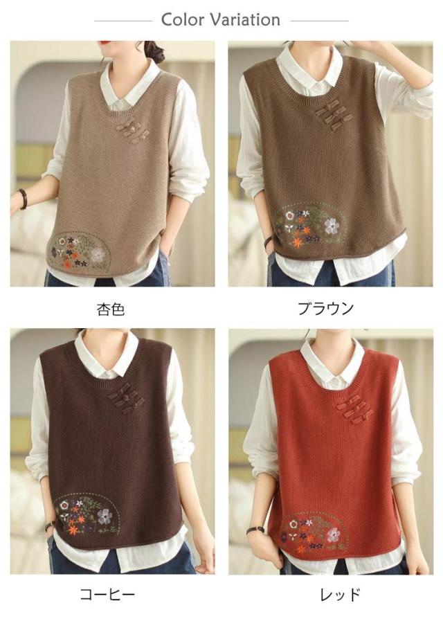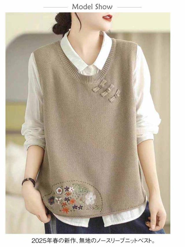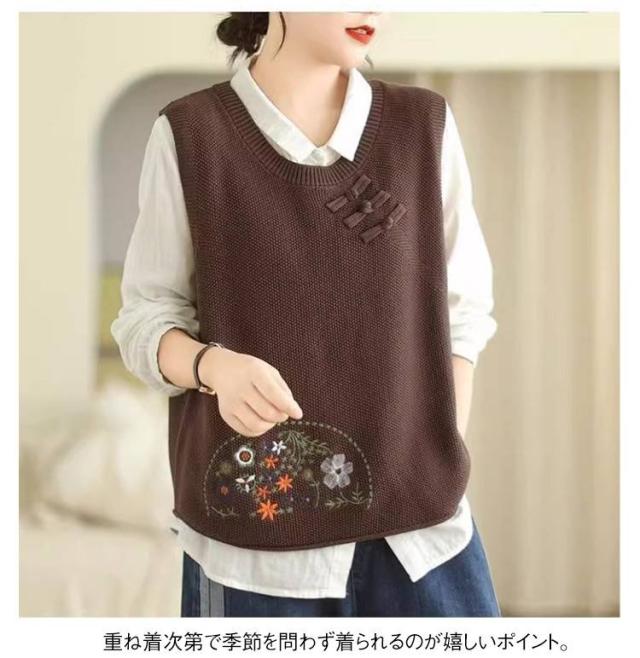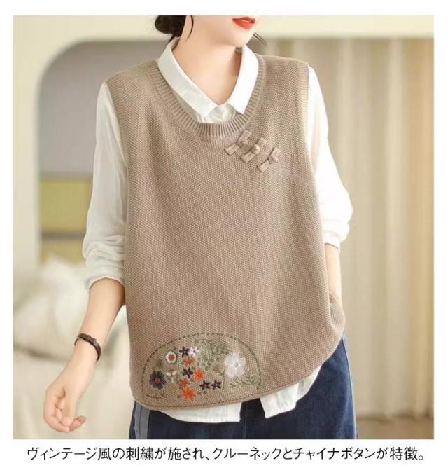ノースリーブニット ヴィンテージ風 クルーネック 刺繍 ゆったり 女性用 ベスト チャイナボタン トップス プルオーバー ニット ニットベスト 袖なし レイヤード カジュアル ノースリーブニット お洒落