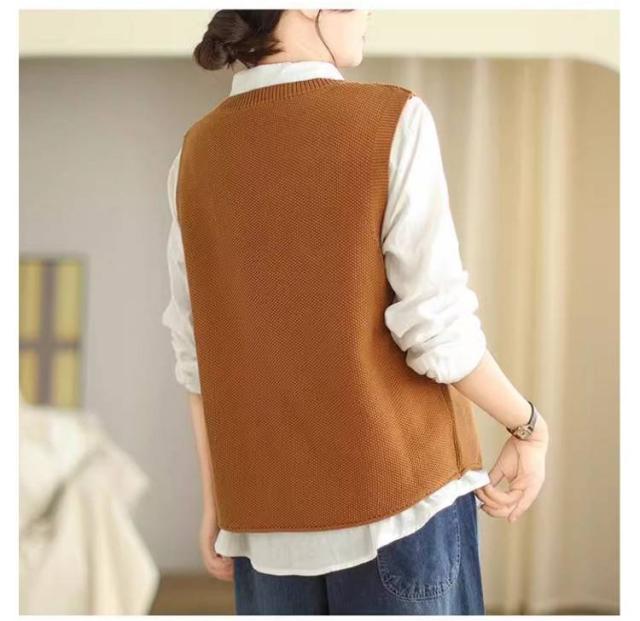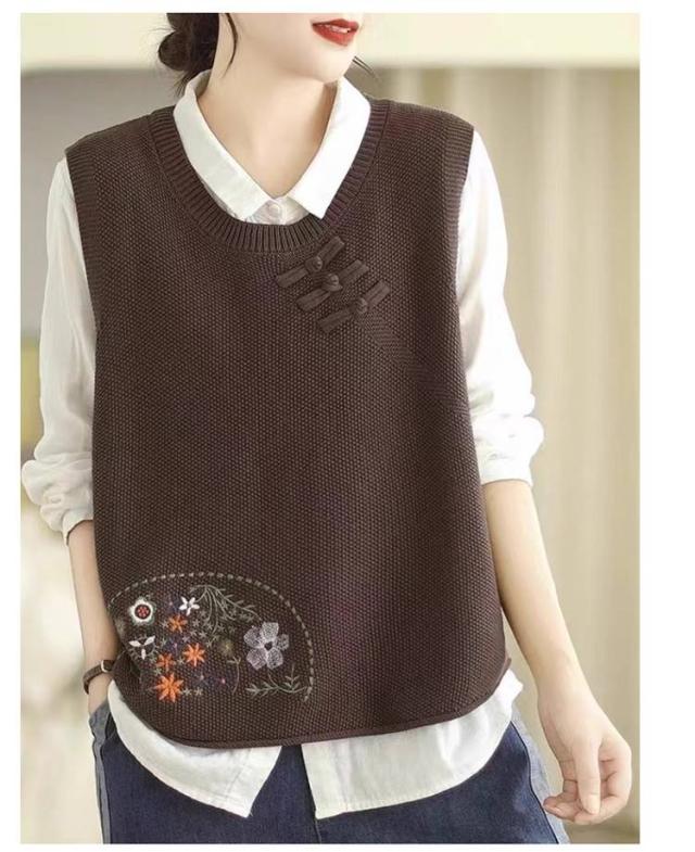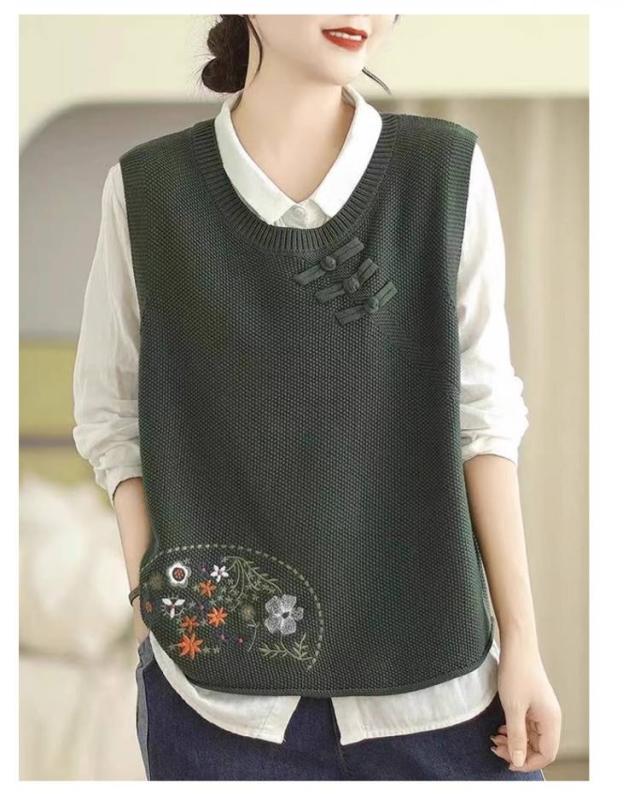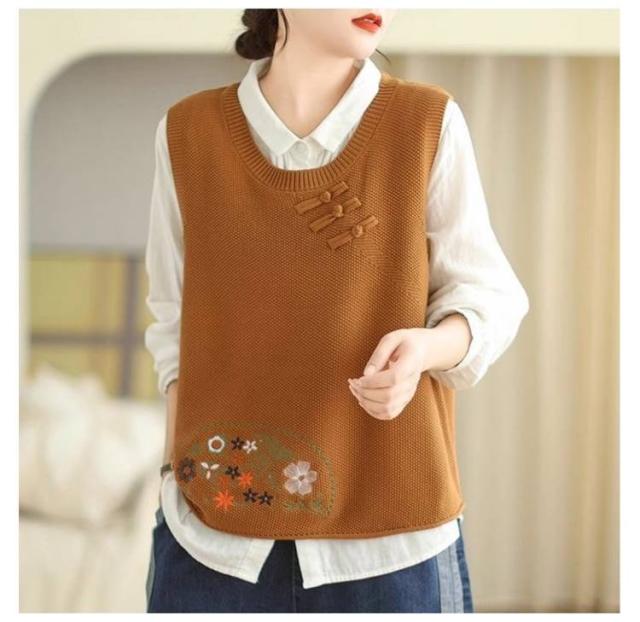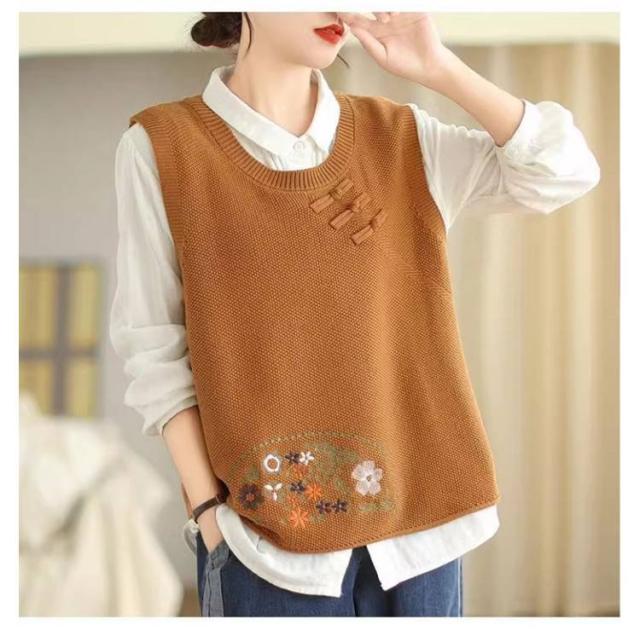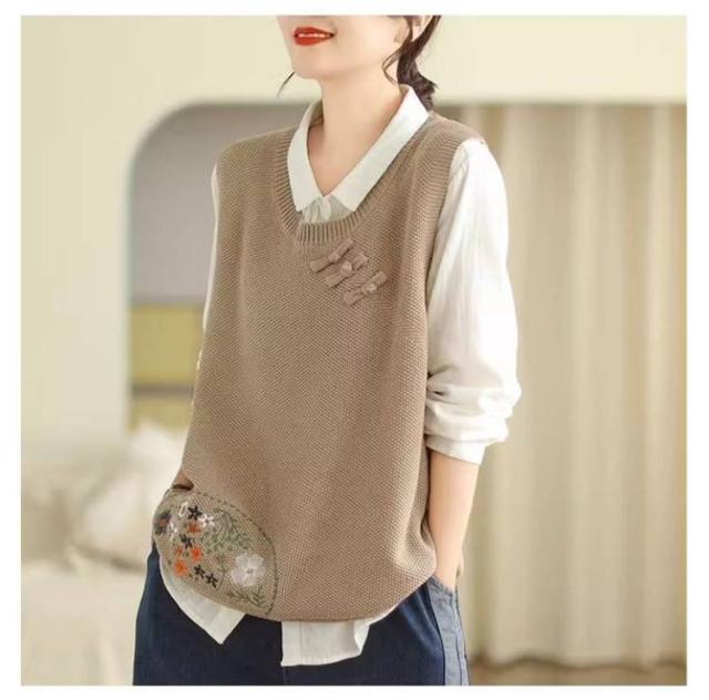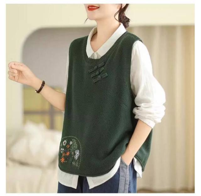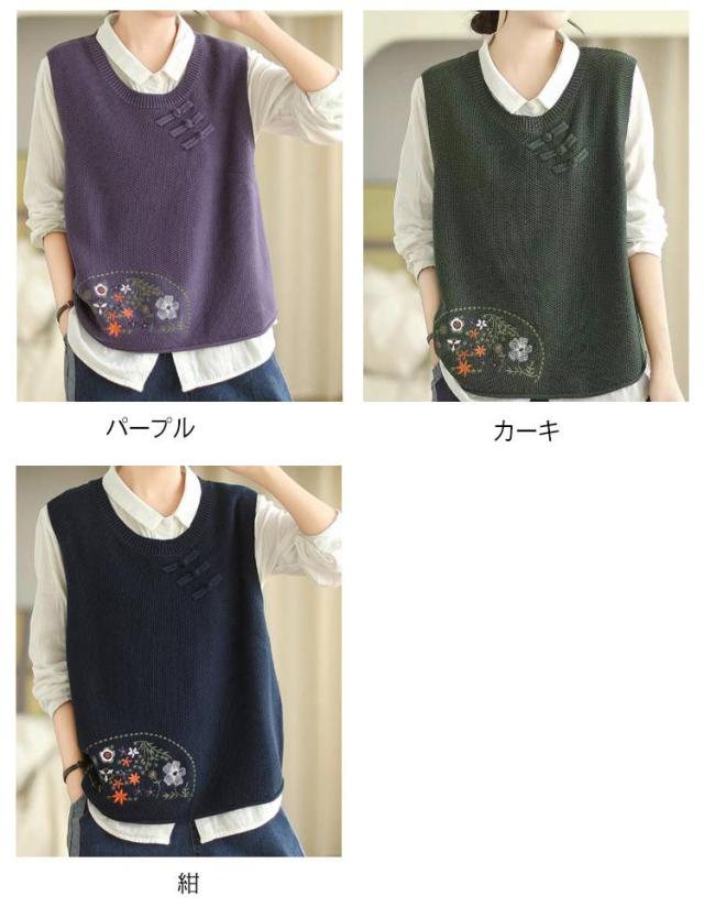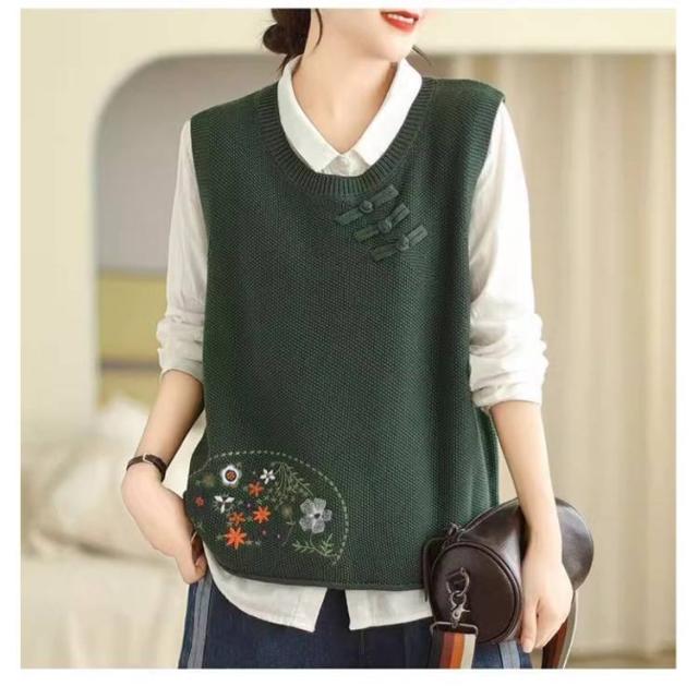 ノースリーブニット ヴィンテージ風 クルーネック 刺繍 ゆったり 女性用 ベスト チャイナボタン トップス プルオーバー ニット ニットベスト 袖なし レイヤード カジュアル ノースリーブニット お洒落