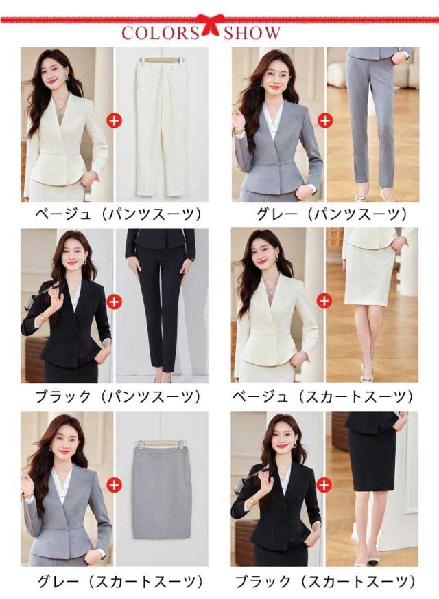 | 色 | ベージュ(パンツスーツ) グレー(パンツスーツ) ブラック(パンツスーツ) ベージュ(スカートスーツ) グレー(スカートスーツ) ブラック(スカートスーツ) |