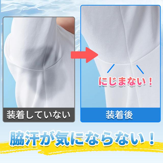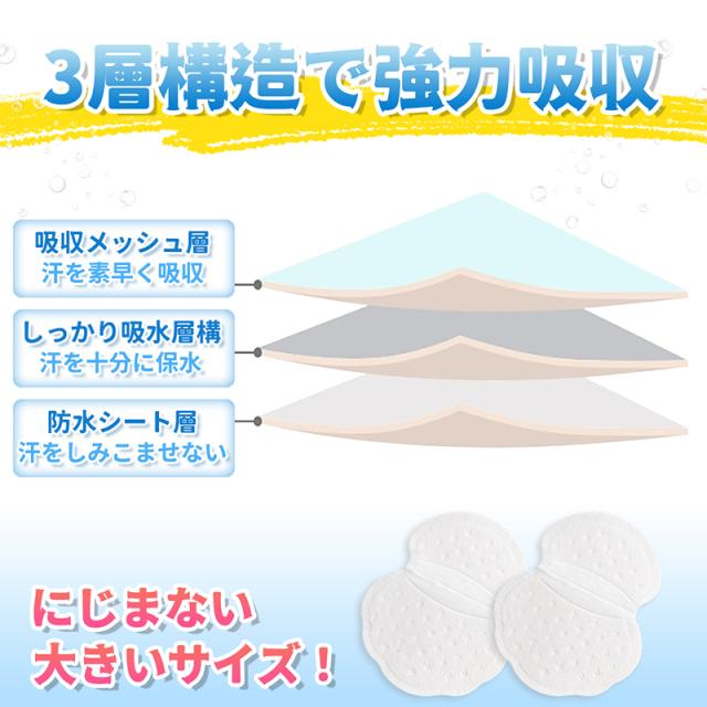【にじまない3層構造】1層目:吸汗メッシュ層→汗を素早く吸収;2層目:中綿吸水層→汗を十分に保水;3層目:防水シート層→汗をしみこませない。