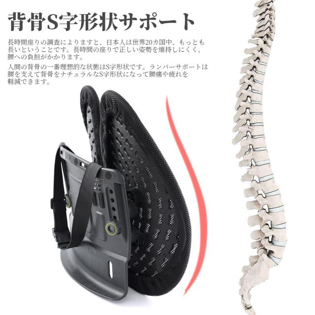 【正しい着座姿勢を保とう】ランバーサポートは背骨を自然な「S字型」に近づけ、座った時の疲労や腰への圧迫を軽減します。 仕事で長時間座りの人におすすめです。