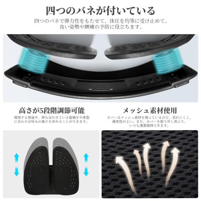 【四つのバネが付いている】四つのバネで弾力性をもたせて、体圧を均等に受け止めて、良い姿勢や腰痛の予防に役立ちます。