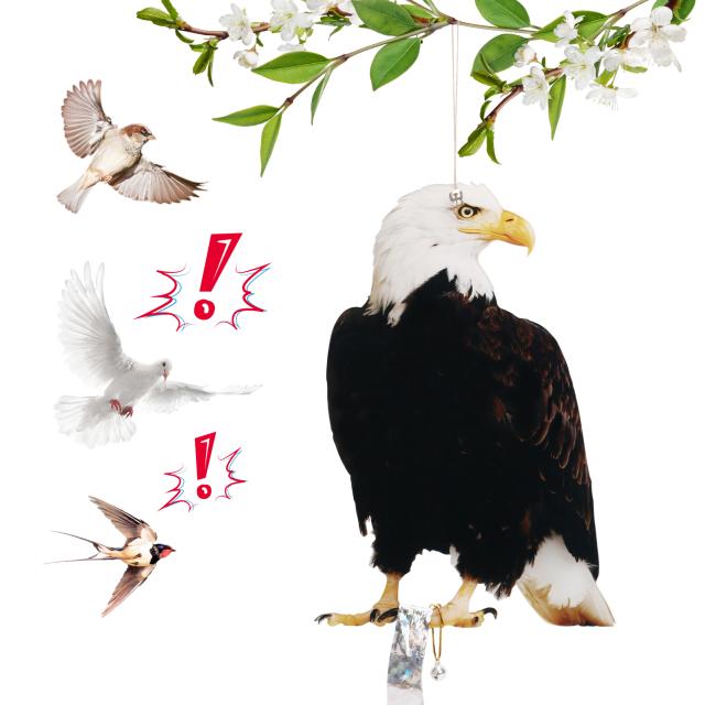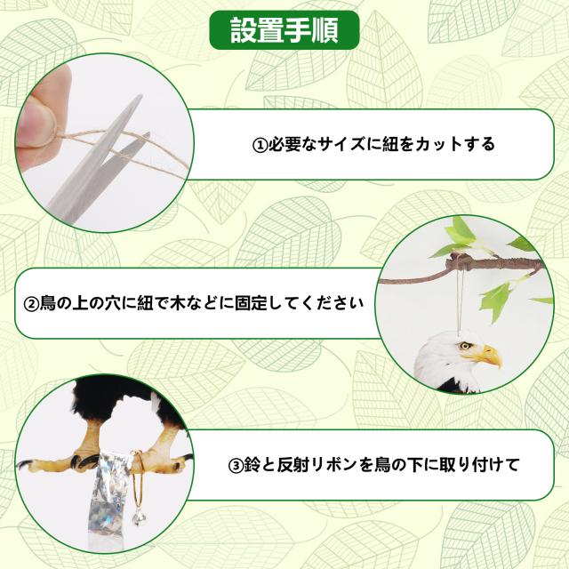 梱包内容:鳥避けダミー*1、72cm麻紐、小さな鈴2個、60cm×2.4cm反射リボン;