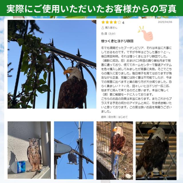 【環境にやさしい】 鳥を傷つけたり、殺したりすることなく、安全に鳥を追い払えます。設置が簡単で、すぐに鳥よけ効果が期待できます。
