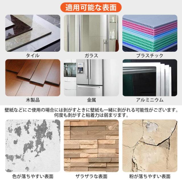 | テープを外しやすい | テープの取るコツ 貼った後のテープの隙間に少し水を入れさせたら、自然に取れやすくなれます。原理:テープの粘着面が水分と接触すると、粘着性がしばらく減ります。取ってから干して水がなくなるまで、また粘着性が戻れます。 |