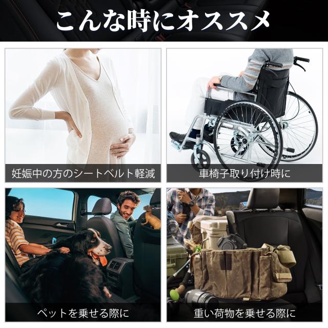 【用途】妊娠中の方のシートベルト軽減、ペットを乗せる際に、重い荷物を乗せる際に、車椅子取り付け時に使用できます。人間が乗車する際に使用しないでください。ベルト着用の義務を守りましょう。また溝への埃などを防ぎます。