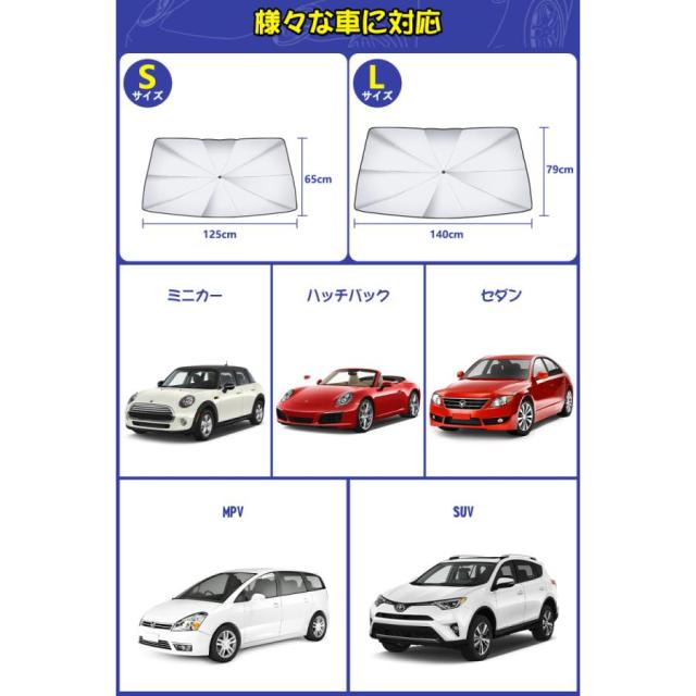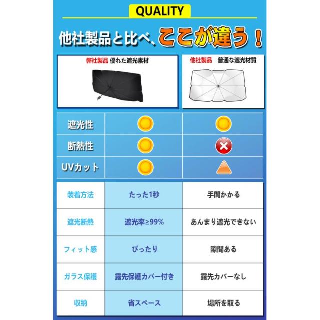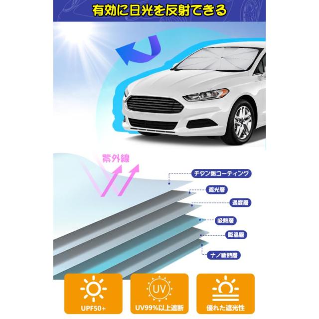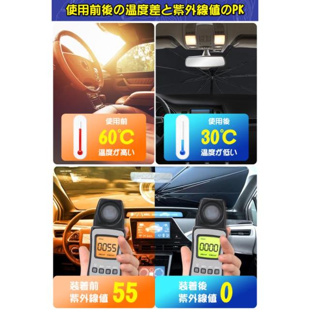 | 日差しよけ | 【内装劣化防止】 車用サンシェードは遮光遮熱用だけでなく、自動車内装、ダッシュボード、ハンドル、レザーシート、電子機器を猛烈の陽射しからしっかり守ってくれます。ダメージや経年劣化を防ぎ、寿命をのばします。 |
