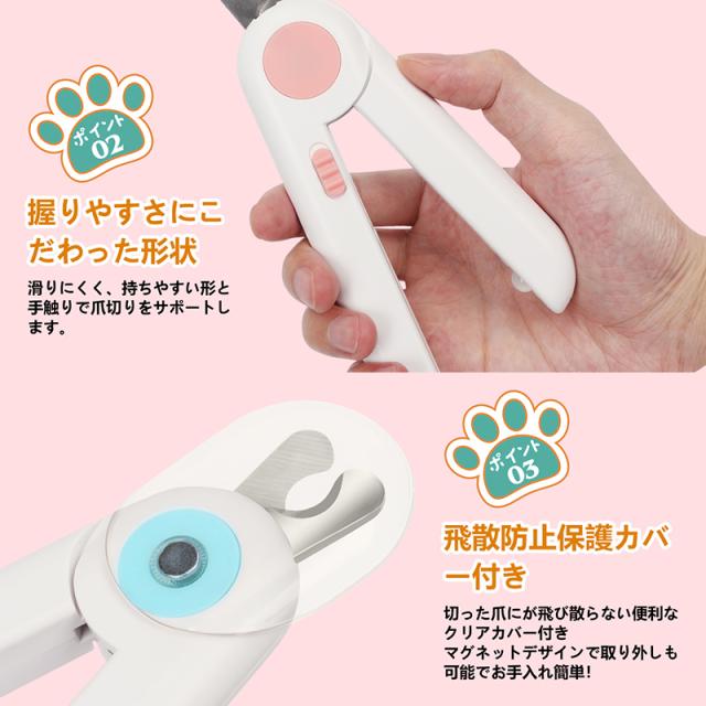 【高輝度LEDライト】LED付きで見やすいペット用爪切り、☆ペットの爪を照らすことで、爪と血管を見分け易くなり、深爪や出血を防ぎます。☆保護カバー付きで、爪の飛び散りを防ぎます。