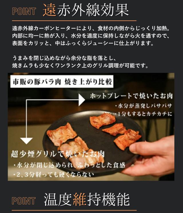 熱源回りもミラーフィニッシュのステンレスを使用しているのでサイドからの熱を食材に反射させ、ムラなくしっかりと焼けます。遠赤外線効果により、食材の芯までじんわりと焼けるので、まるで炭火焼きのように柔らく旨みを閉じ込めた美味しい焼き上がりになります。