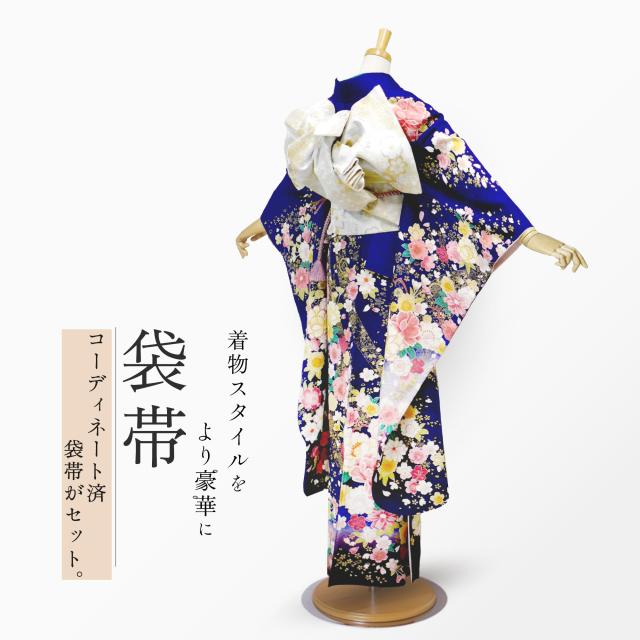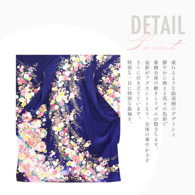 レンタル 振袖 貸衣装 フルセット ハイクラス 豪華 絹素材 絵羽柄【画像の帯がセット】成人式 結婚式 古典 青紺 桜 華やか ピンク【No.1517】