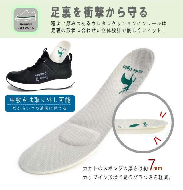 インソールには立体成型のウレタンクッションを採用。土踏まずにはアーチサポートを設置し歩行をサポート。