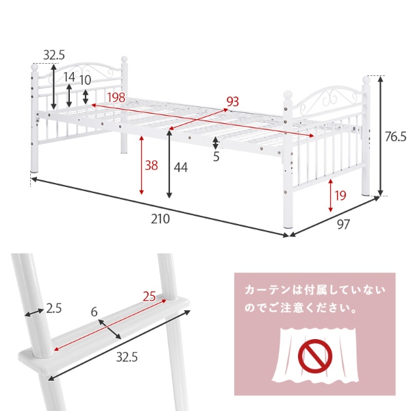 カーテンを取り付けられるロフトベッド KH-3592 まるでプリンセスが住むお城のようなエレガントなデザインのパイプロフトベッドです。市販のカーテンを取り付けて使え、好きなものに囲まれた憧れの空間を作れるハイタイプ。 ■カラー:ホワイト ■品番:KH-3592WH ■商品サイズ(約) ロフトベッド時:幅97×奥行210×高さ183cm(床板高さ:151cm) シングルベッド時:幅97×奥行210×高さ76.5cm(床板高さ:44cm) ■材質:スチールパイプ ■生産国:中国 ■備考 ・床面サイズ:W93×L198 ・カーテンポール付 ・カーテンは別売りです ・組立品(工具は付属) ※お客様組立て品につきましては、組み立て後に不良の連絡をされても対応ができません。組み立て前にパーツに不良・傷等がないか、必ずご確認下さいますようよろしくお願い申し上げます。 ※記載は商品仕様の一部です。仕様説明不足等の理由での返品はできません。特に適合等は必ずご確認ください。