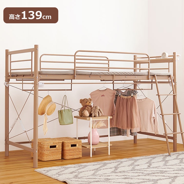 好きなカーテンが取り付けられるロフトベッド 高さ139cm 大人 子供 パイプベッド シングル ベッド 宮付 シングルベッド フレーム ベッドフレーム コンセント付き 宮棚 棚 新生活 一人暮らし 子供部屋 可愛い おしゃれ ハンガーポール 階段 システムベッド