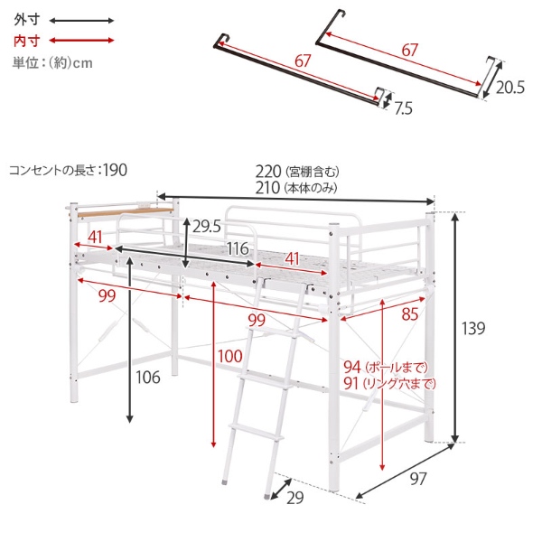 ロフトベッド時:幅97×奥行220×高さ139cm(床板高さ:106cm)