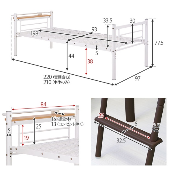 シングルベッド時:幅97×奥行220×高さ77.5cm(床板高さ:44cm)