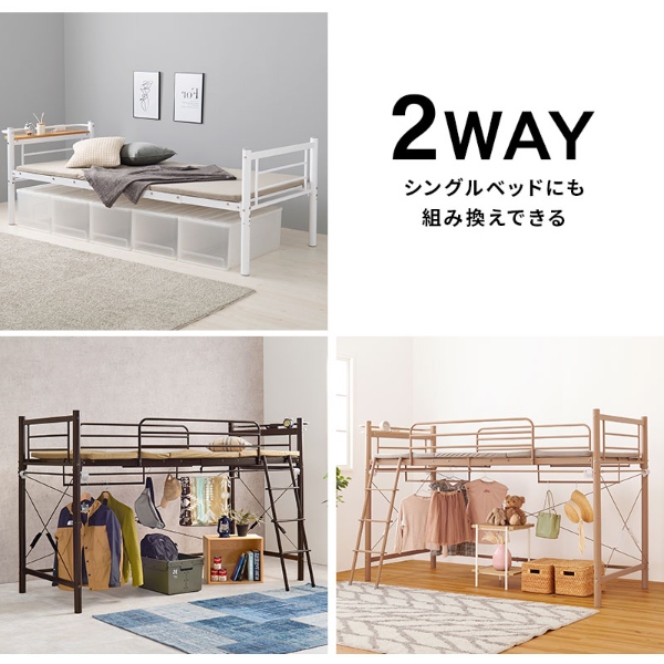 カーテンを取り付けられるロフトベッド KH-3690 【キャラメルブラウン】 ベッド下の空間に市販のカーテンを取り付け可能なパイプロフトベッド。ハンガーポールもついているので衣類収納としても活躍。床面が高すぎず、小物などの収納スペースも確保できるロータイプ ■カラー:キャラメルブラウン ■品番:KH-3690LT ■商品サイズ(約) ロフトベッド時:幅97×奥行220×高さ139cm(床板高さ:106cm) シングルベッド時:幅97×奥行220×高さ77.5cm(床板高さ:44cm) ■対応マットレスサイズ(約):幅92×高さ198cmまで ■材質:スチールパイプ ■生産国:中国製 ■備考 ・床面サイズ:W93×L198 ・カーテンは別売りです ・2口コンセント付 ・カーテンポール付 ・ハンガーポール付 ・組立式 ※お客様組立て品につきましては、組み立て後に不良の連絡をされても対応ができません。組み立て前にパーツに不良・傷等がないか、必ずご確認下さいますようよろしくお願い申し上げます。 ※記載は商品仕様の一部です。仕様説明不足等の理由での返品はできません。特に適合等は必ずご確認ください。