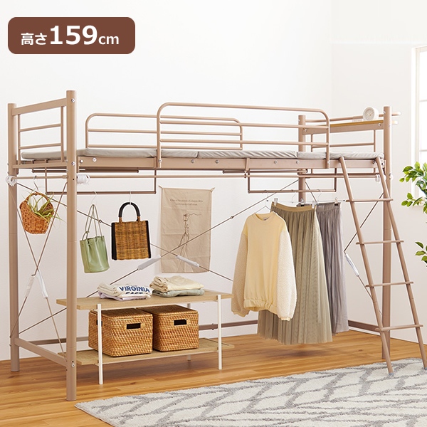ベッド下の空間に市販のカーテンを取り付け可能なパイプロフトベッド。ハンガーポールもついているので衣類収納としても活躍。季節家電や本、小物などの収納スペースが確保できるミドルタイプ