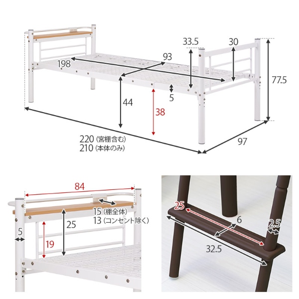 シングルベッド時:幅97×奥行220×高さ77.5cm(床板高さ:44cm)
