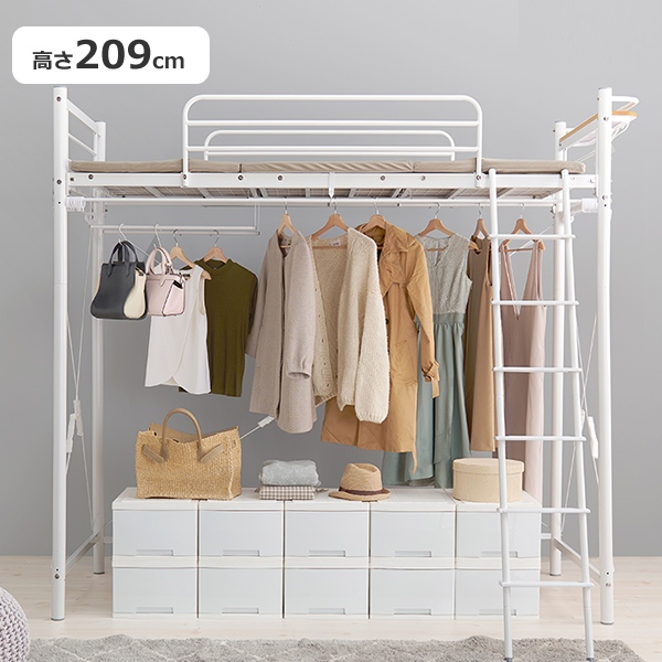 ロフトベッド スパーハイ 高さ209 シングル 宮付き おしゃれ 可愛い パイプベッド ハンガー付き ベッドフレーム コンセント 棚 ホワイト