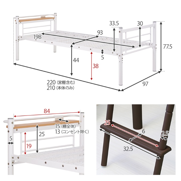 シングルベッド時:幅97×奥行220×高さ77.5cm(床板高さ:44cm)