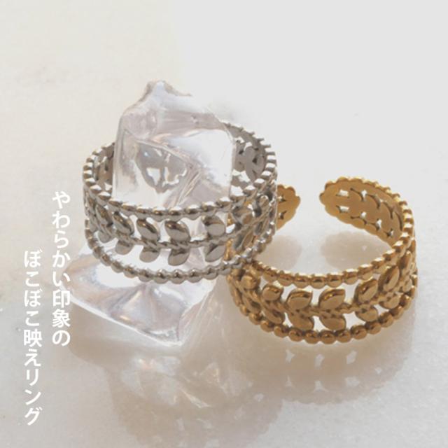 リーフデザインのモチーフが特徴的なぼこぼことした見た目のリングです。
