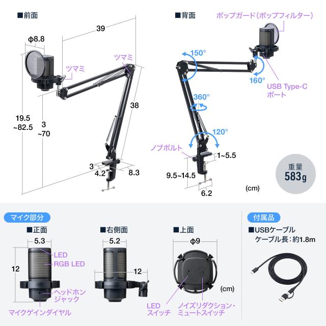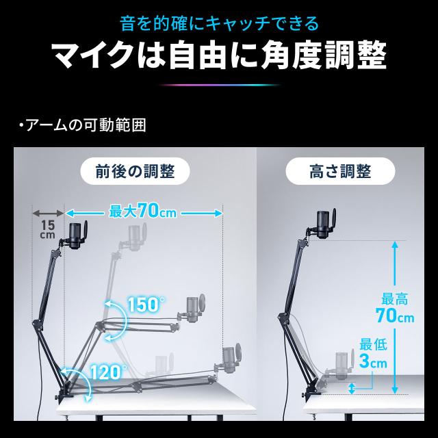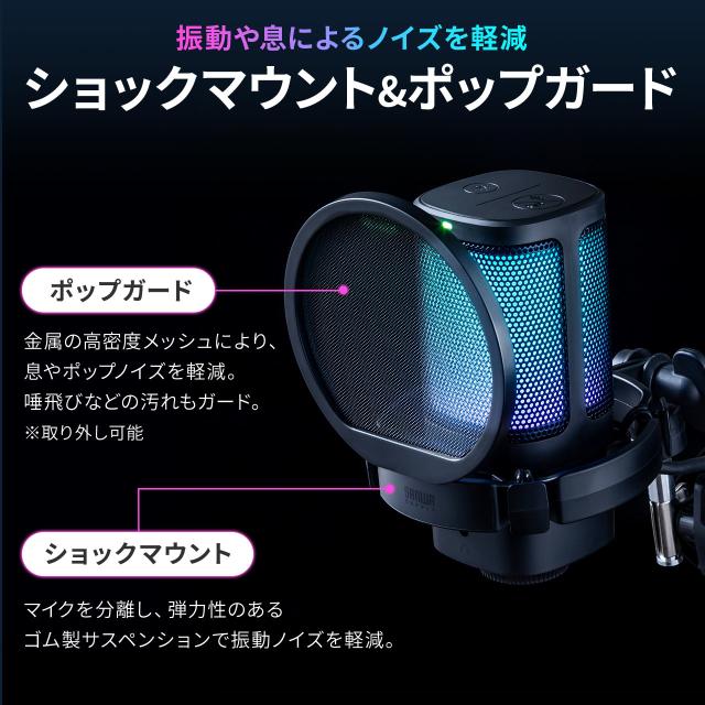 ⇒ご購入の前にご確認下さいゲームや音声収録、動画配信やWEB会議に最適なUSBゲーミングマイク。アームスタンド付きでマイク位置を自由自在に調整可能。ショックマウントやポップガード付きで息や振動ノイズを軽減。RGBライティングでゲーム部屋を演出でき、ライティングをオフにすることでオフィスでも使用できます。【WEB限定商品】