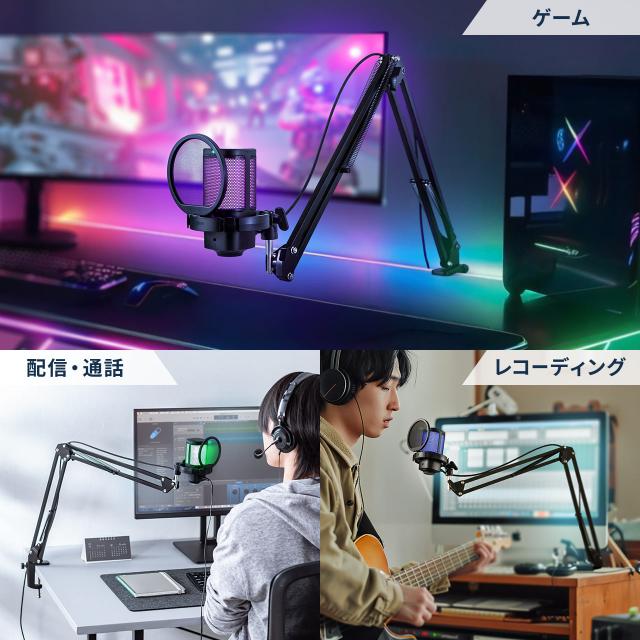 USBゲーミングマイク コンデンサーマイク RGBライティング ノイズキャンセル 単一指向性 アームスタンド付き 配信用 ゲーム実況 ボイスチャット web会議 録音 PC PS5/4[400-MC023]
