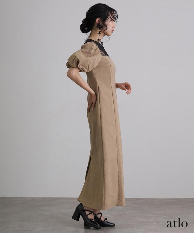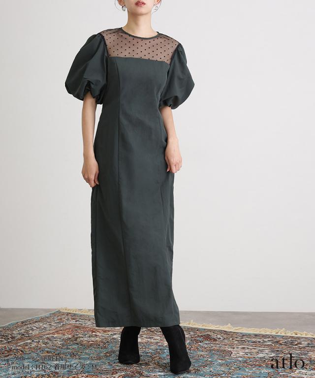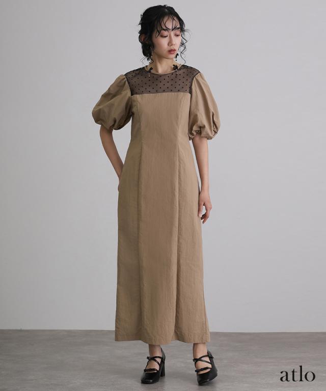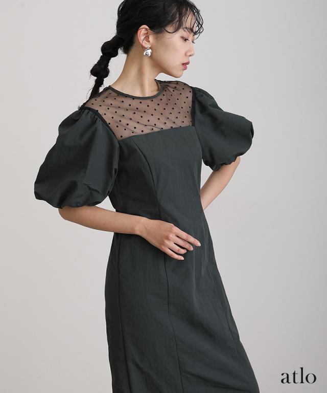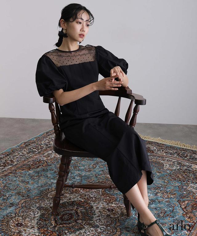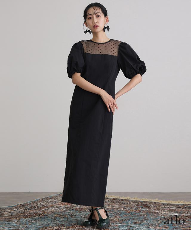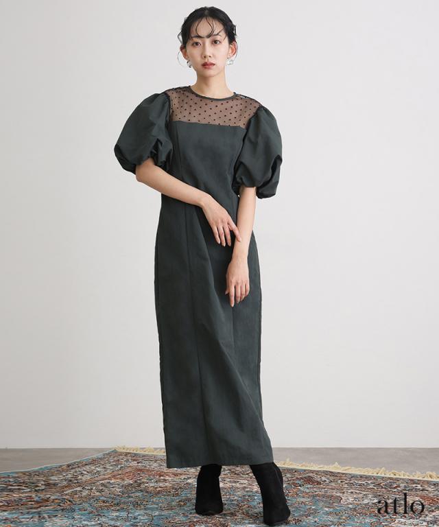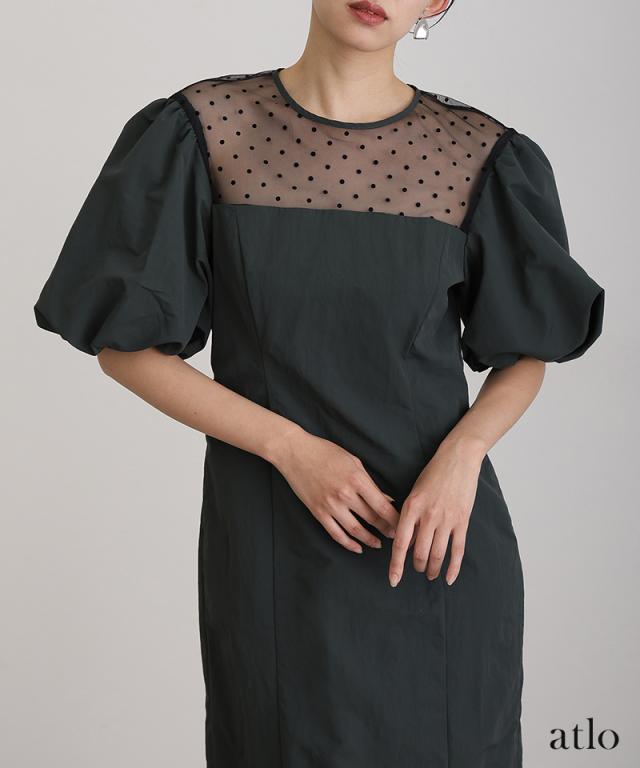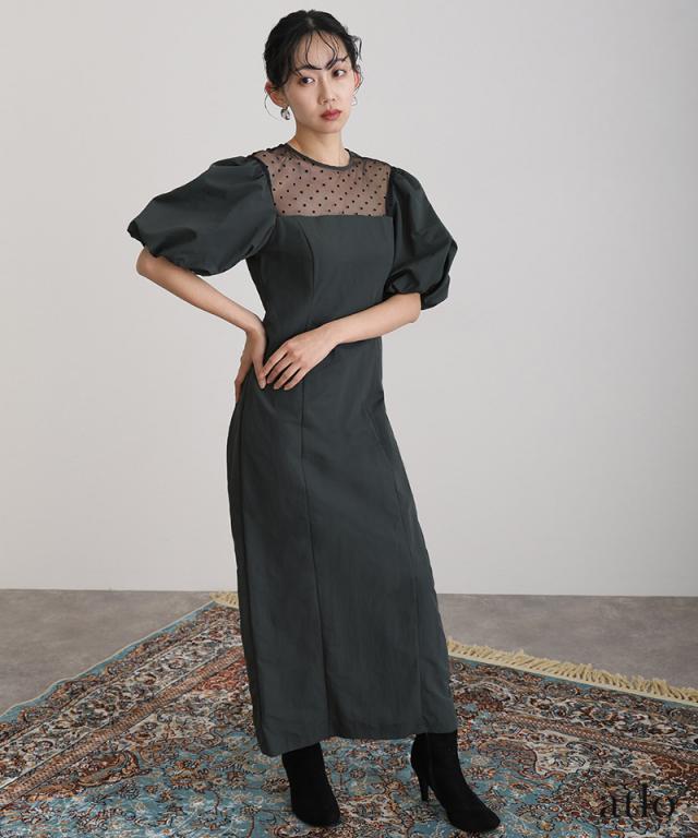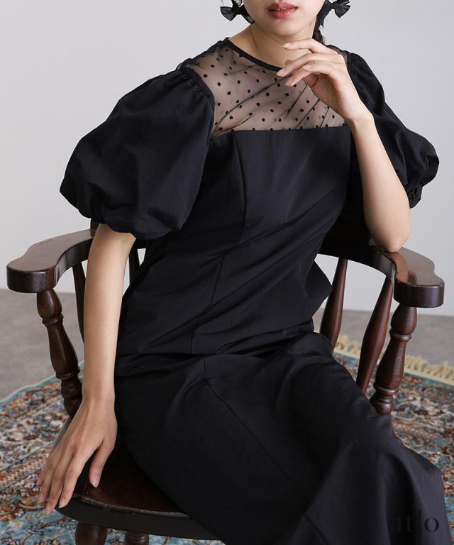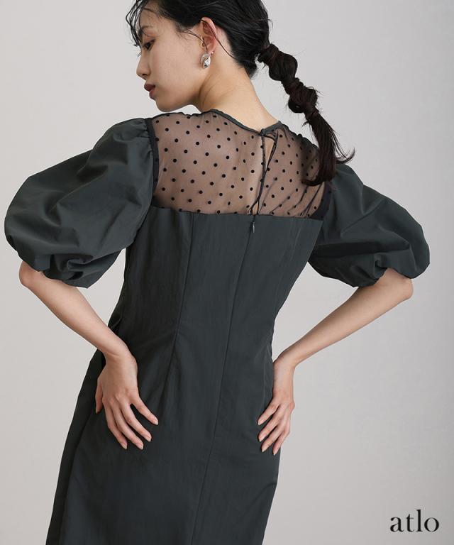 デコルテに施したドットフロッキーのチュールと、たっぷりボリュームのパフスリーブでフェミニンムード漂うデザインドレス。