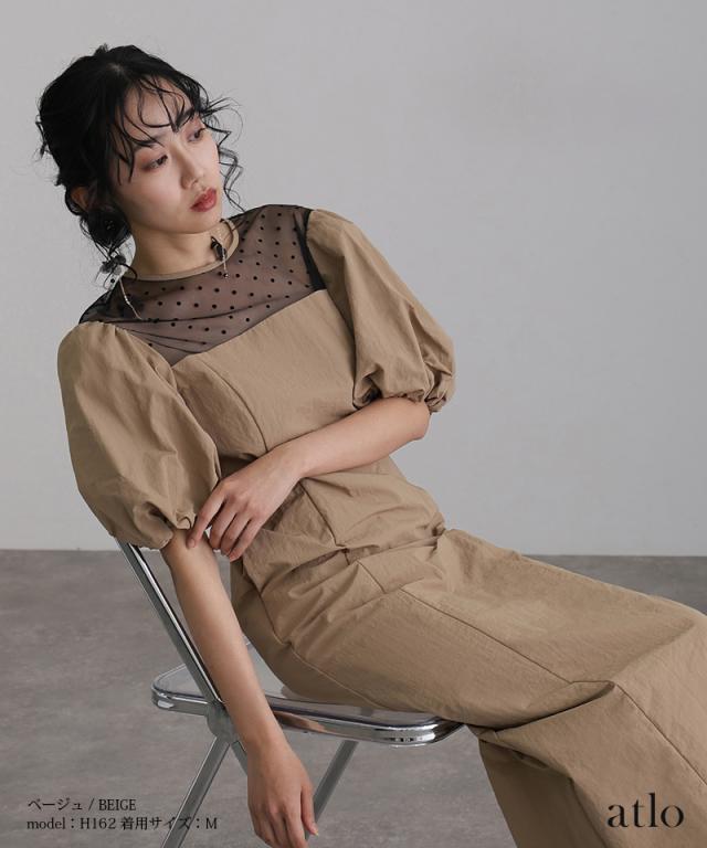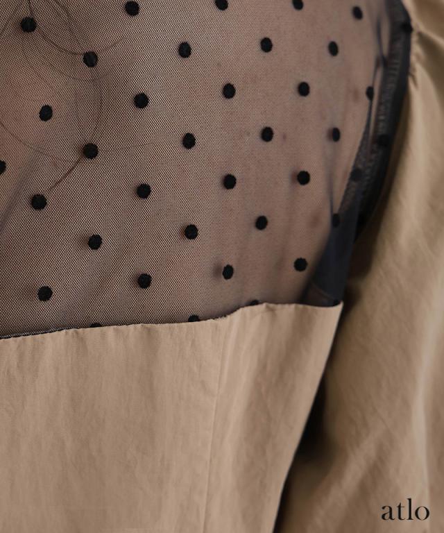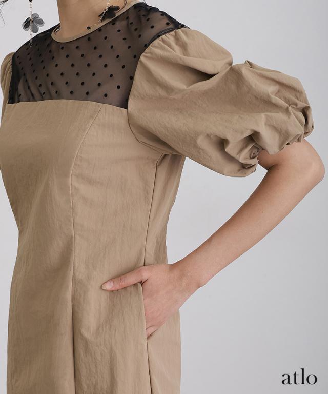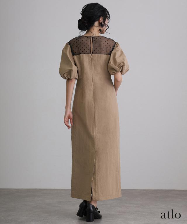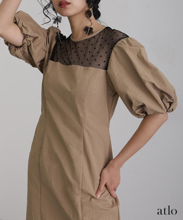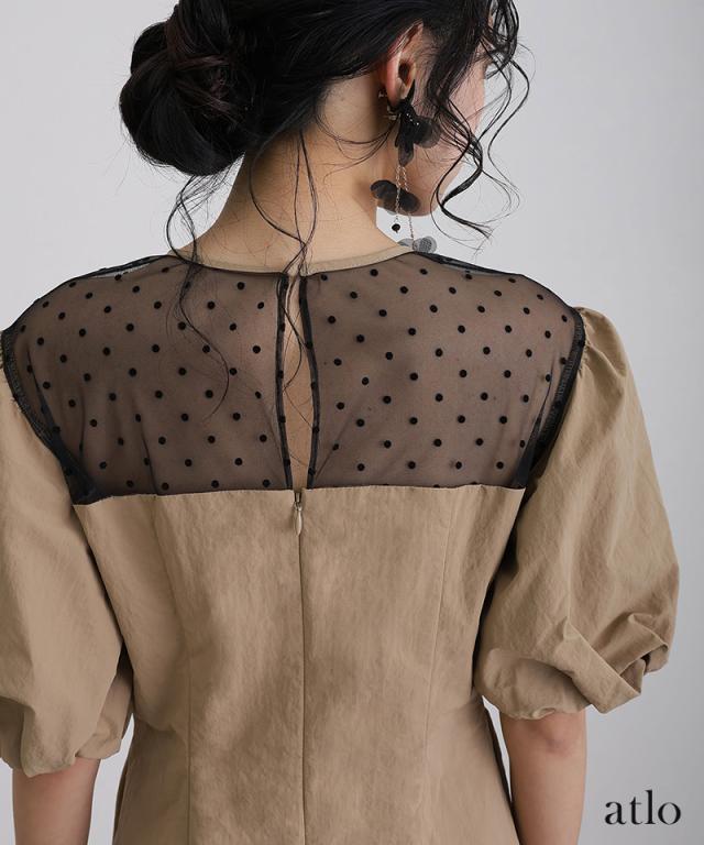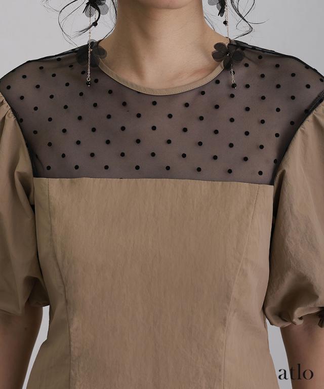 ドット柄チュールがデコルテに立体感と華やかさをプラス。