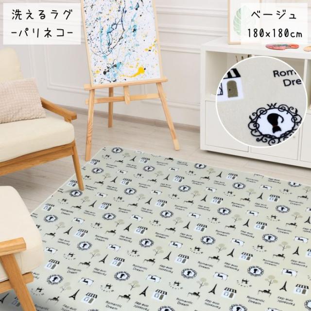 ご家庭で洗えるラグ パリネコ 180x180cm 2畳用 ベージュ色 ネコ柄 ホットカーペットカバー こたつ敷